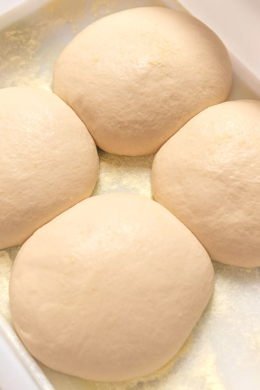 - Ungefähr 2–3 Stunden vor der Zubereitung der Pizzen den Pizzateig aus dem Kühlschrank nehmen und vier gleichmäßige Teiglinge formen. Die Teiglinge in der Teigwanne abgedeckt für weitere 2–3 Stunden bei Zimmertemperatur gehen lassen. Somit erhöht sich die Temperatur der Teiglinge ein wenig, wodurch sich diese einfacher verarbeiten lassen.